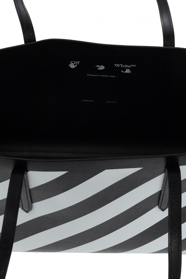 Black shopper bag from Off-White. Made of leather, this design features a printed white logo pattern, two half-round handles, silver-tone metal hardware, a detachable colourful shoulder strap and one internal compartment with a zipped pouch on a strap.