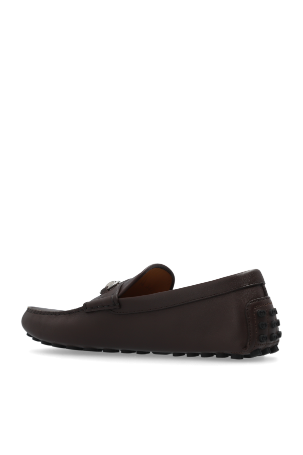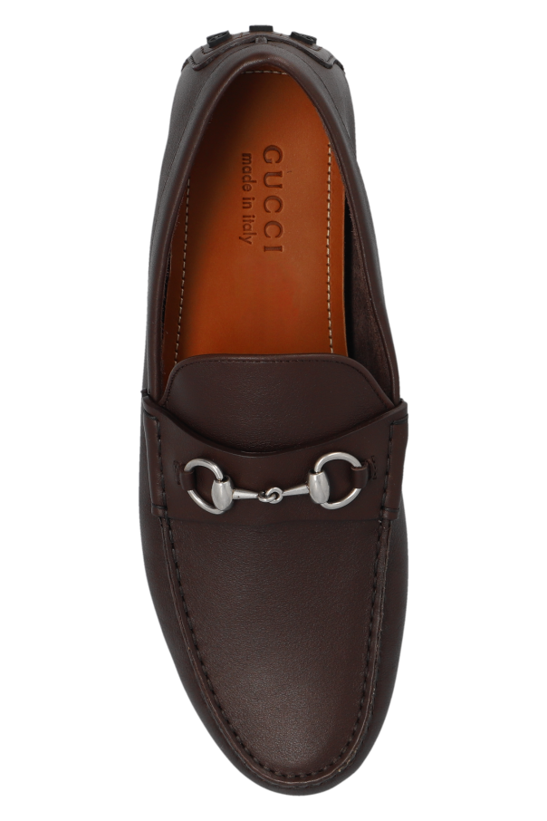 Brown moccasins from Gucci. Made from leather, this model sits on a black rubber sole and showcases silver-tone horsebit hardware on the front.