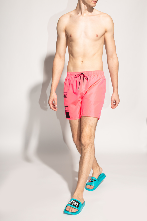 Blue slides from Diesel. Made of rubber, this pair features a blue rubber sole and a printed logo pattern in red and black.