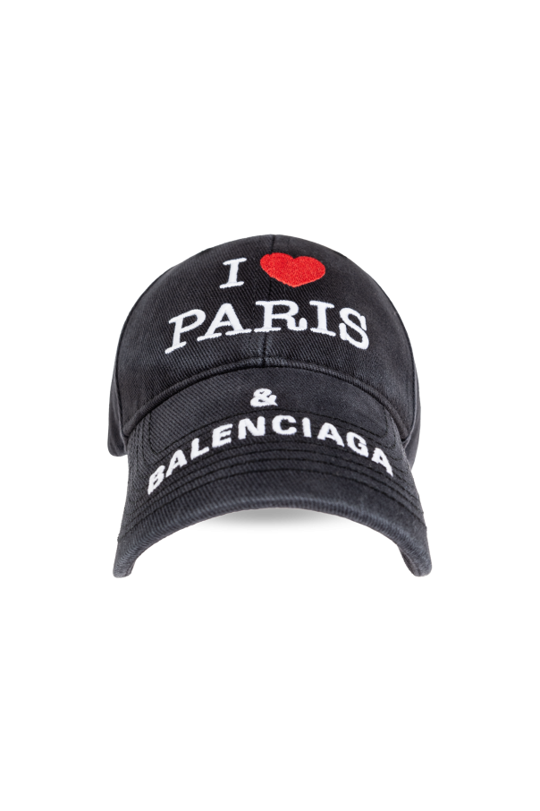 Introducing the Logo Baseball Cap, an exclusive creation by the illustrious house of Balenciaga. This exquisite black cap, crafted from a fabric with a cotton-like texture, exudes sophistication and modernity. The front proudly displays the iconic white inscription \"I ❤️ PARIS\" with a striking red heart, accompanied by \"& BALENCIAGA\" discreetly below, ensuring an unmistakable touch of luxury. Designed for the connoisseur of fine men\'s accessories, this cap boasts a subtly washed effect that enhances its refined aesthetic. The adjustable back closure offers a customizable fit, marrying function with form. A testament to Balenciaga\'s legacy of impeccable craftsmanship and visionary design, this cap is an ode to both heritage and contemporary style. Why Choose This Product? Exclusive design by Balenciaga, a revered name in fashion. Features a distinctive logo that signifies luxury. Adjustable fit for personalized comfort. Elegant cotton-like texture with a unique washed effect.