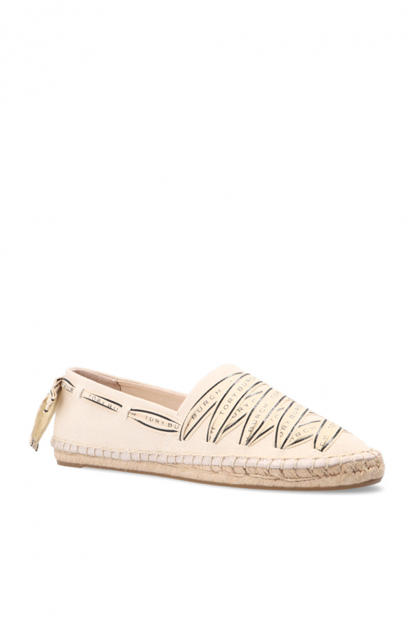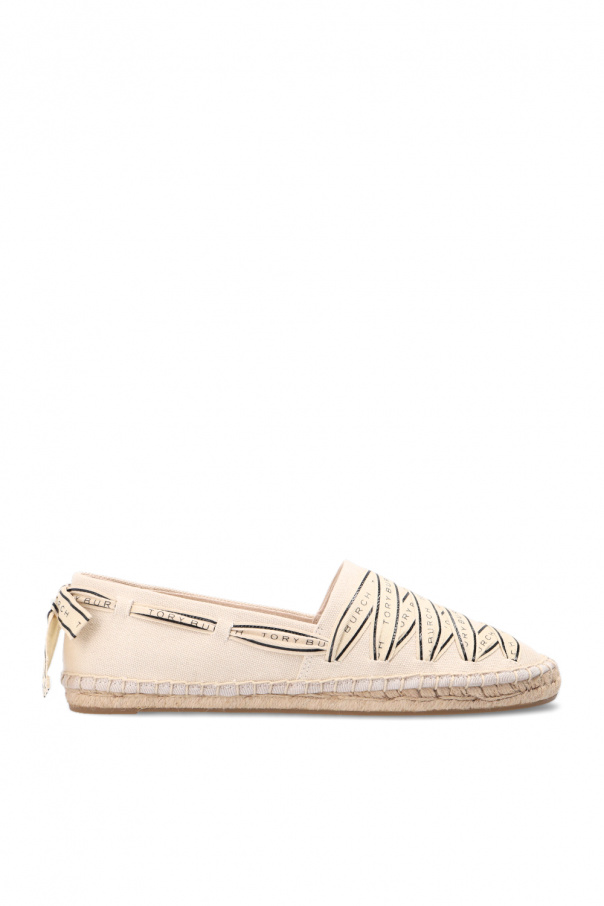 Beige ‘Tory’ espadrilles from Tory Burch. Distinguished with criss-crossed grosgrain ribbon ties with a printed black logo, this pair sits on a brown jute sole.
