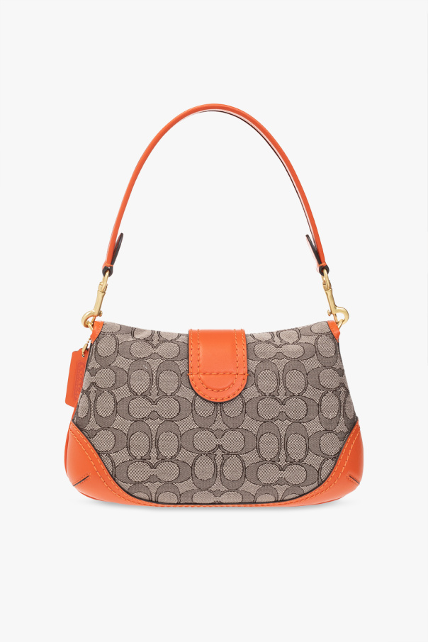 Cream, black and orange \'Soho\' shoulder bag from Coach. Made of canvas and leather, this design features a magnetic closure, monogram pattern, gold-tone metal hardware and one internal compartment with one zip pocket.