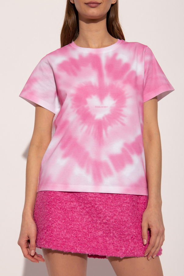 Pink and white crewneck T-shirt from Red Valentino. Made of tie-dyed cotton, this style features an elasticated collar, short sleeves and a pink logo print.