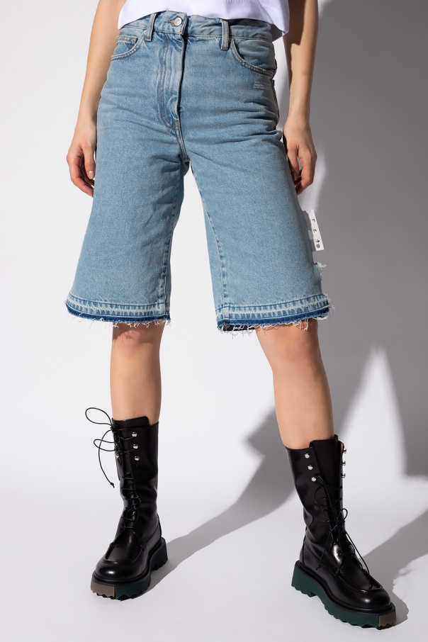 Blue denim shorts from Off-White. Enriched by contrasting orange stitching details and a green logo patch, this pair features a zip fly with a button, five pockets and raw-edge trims.
