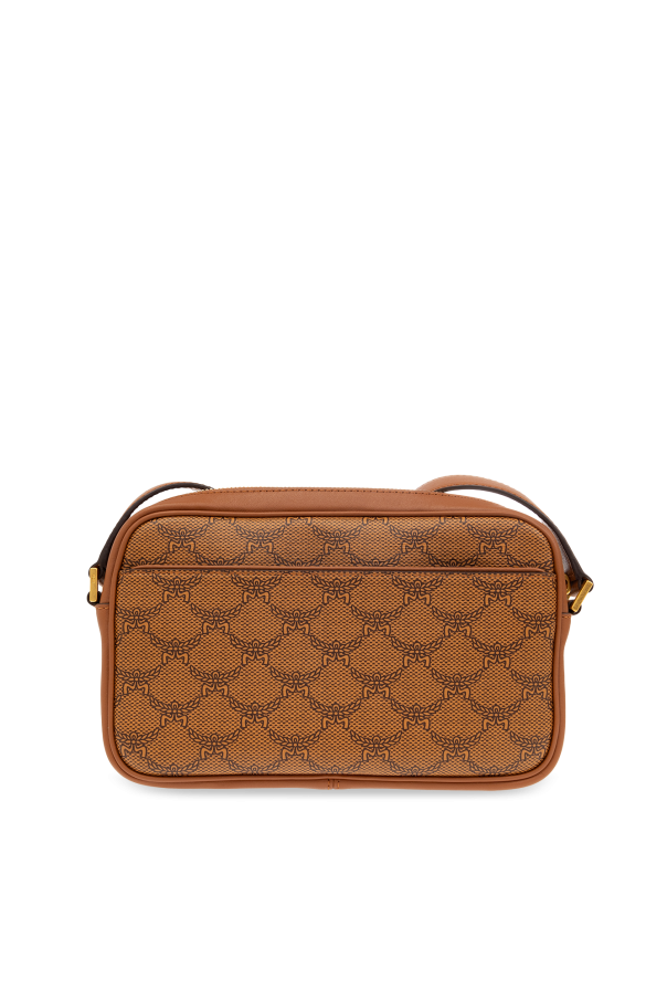 Brown ‘Himmel Small’ shoulder bag from MCM. Made of coated canvas with the Lauretos monogram and leather trims, this model fastens with a zip and is decorated with a black logo print. It is complete with a snap-fastened back pocket, adjustable shoulder strap, metal hardware plated with 24k gold and one internal compartment with three card slots.