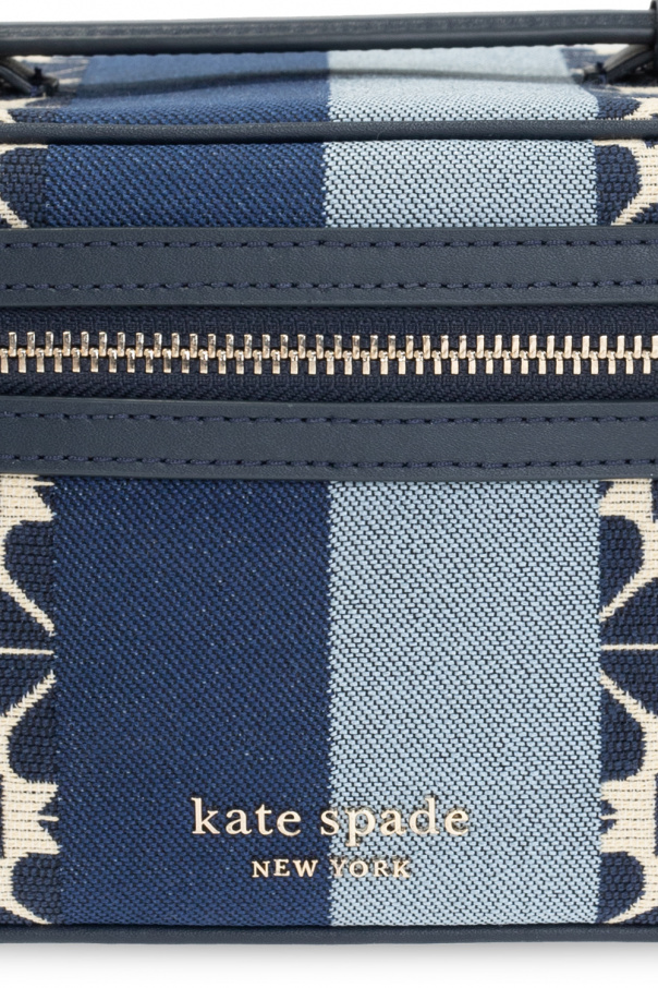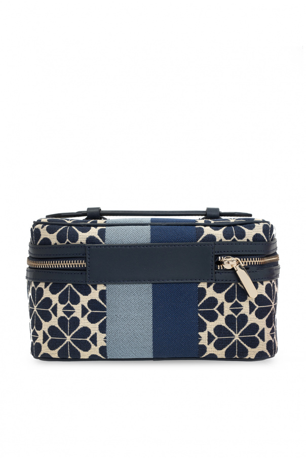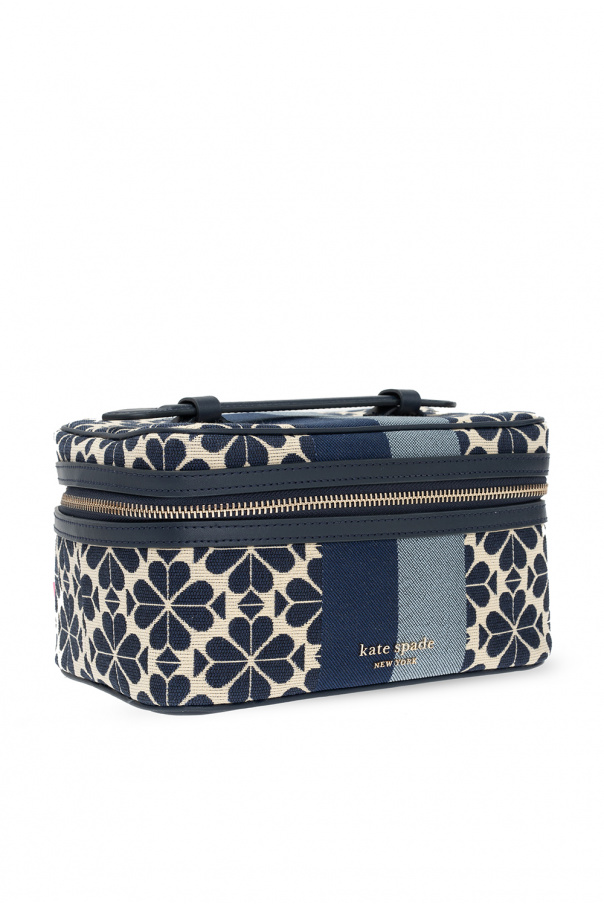 Navy blue and cream wash bag from Kate Spade. Finished with navy blue cow leather, this design showcases a floral jacquard pattern and a navy blue and blue stripe. It is complete with a zip fastening, a gold-tone plaque on the front, a half-round handle and one internal compartment with one slip pocket and one zipped pocket.