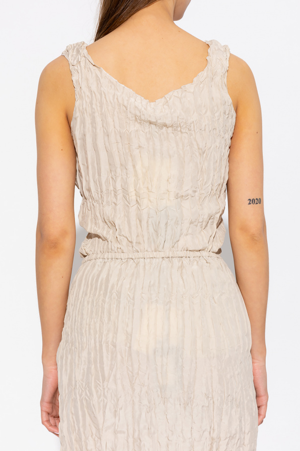 Cream tank top from Toteme. Made of silk with a crinkled effect, this style features pleat detailing and a round neck.
