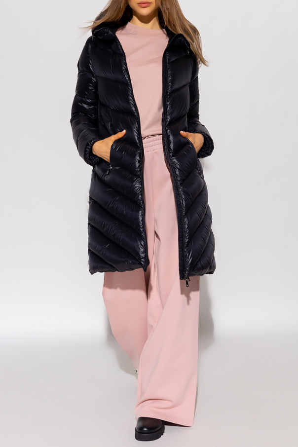 Black ‘Cambales’ long down jacket with a drawcord-adjustable hood from Moncler. Enriched by chevron quilting, this style features a two-way zip fastening, two zip pockets on the front, a branded sleeve patch and elasticated cuffs.