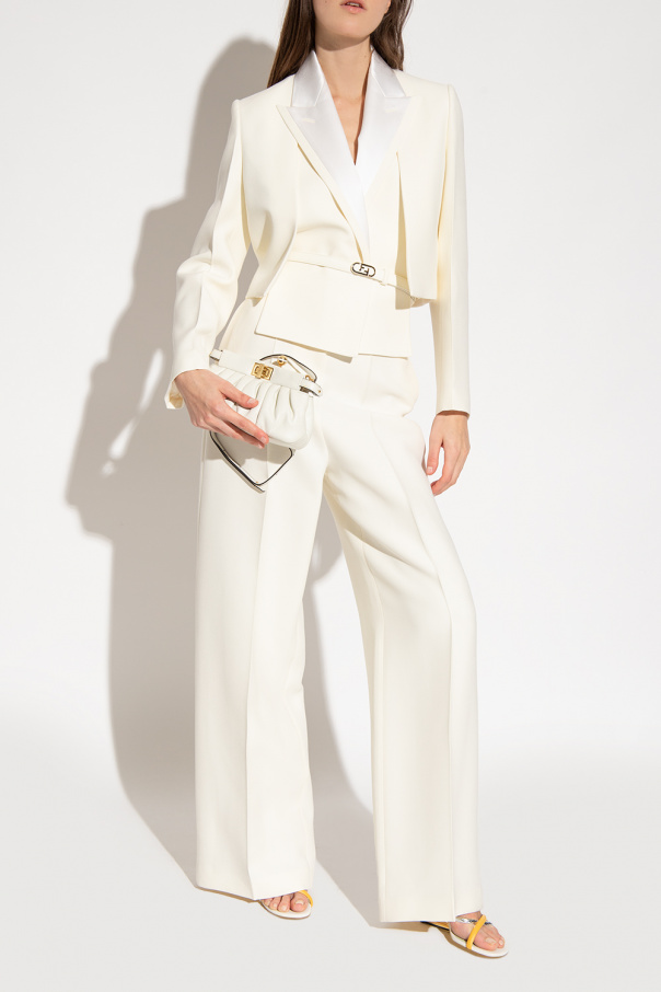 White, brown and yellow ‘Fendi First’ heeled sandals from Fendi. Made of lamb leather, this pair features adjustable buckled ankle straps, dark gold-tone strap decorated with a snakeskin effect, decorative metal heel in the shape of a logo in gold-tone and beige leather sole trimmed with black rubber.