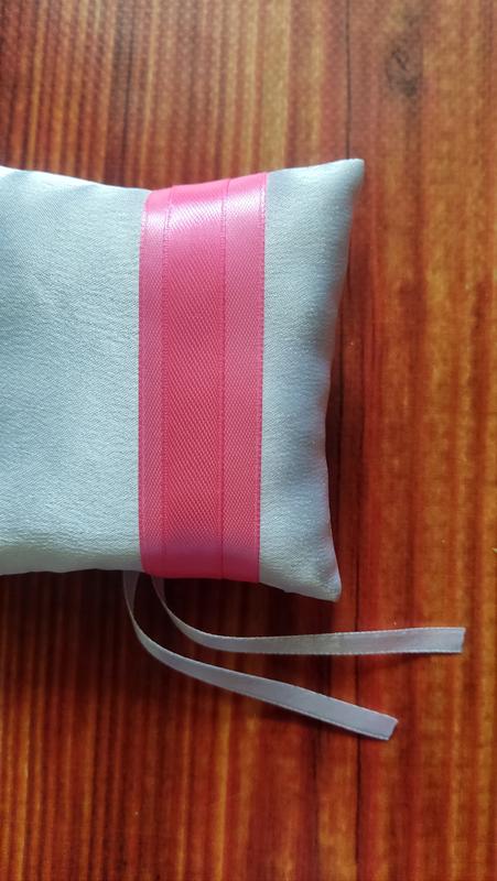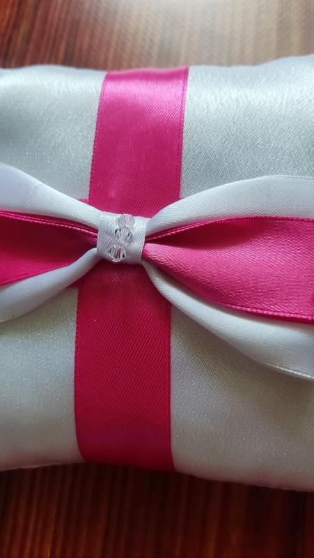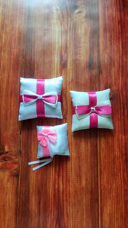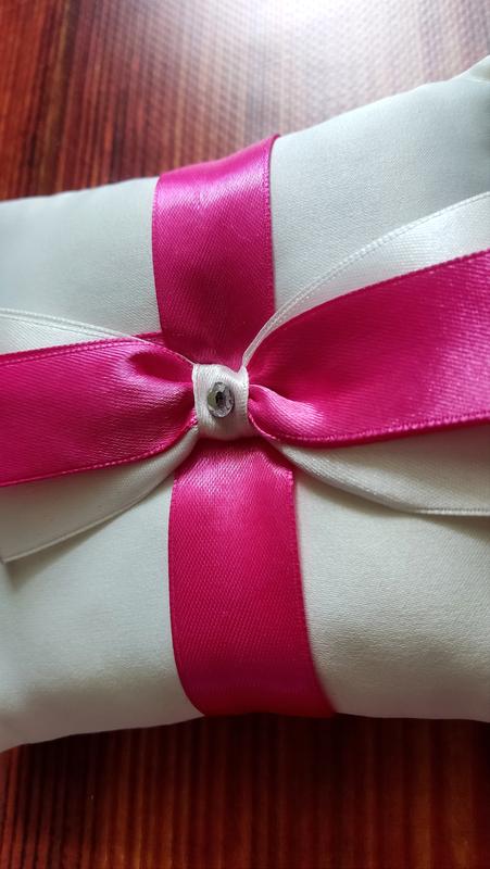 3. Велика з бантами 13*13 см. Щільний молочний атлас виглядає матовим з невеликим відблиском. Темного рожевого кольору стрічка шириною 2 см. У центрі банта білий страз. Зі зворотного боку зовнішня стрічка не підшита.Вартість маленької подушки - 80 грн, 2-ї та 3-ї по 90 грн.