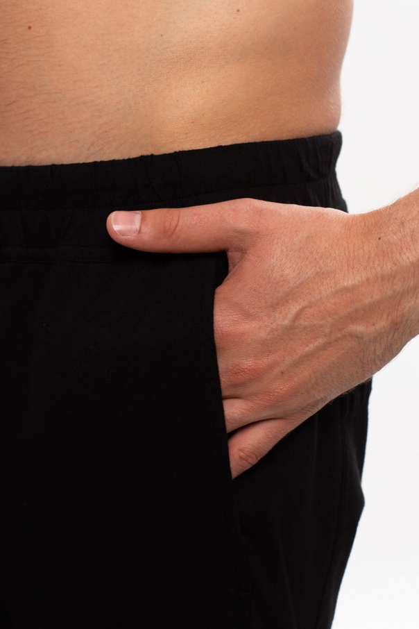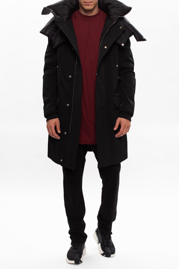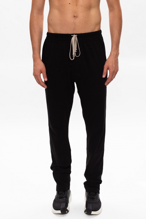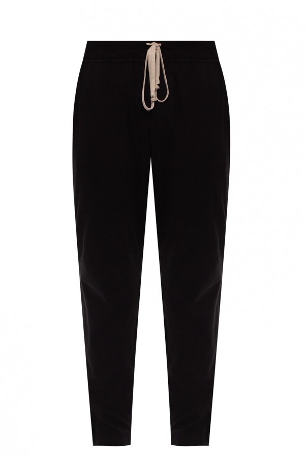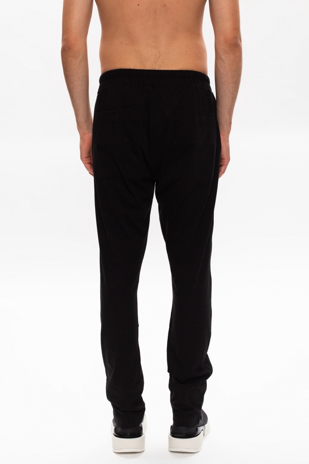 Black trousers from Rick Owens DRKSHDW. Featuring distinctive seams, this cotton-crafted pair is complete with a drawstring waist accompanied by hidden button closing as well as two inset pockets and two velcro-fastened pockets.