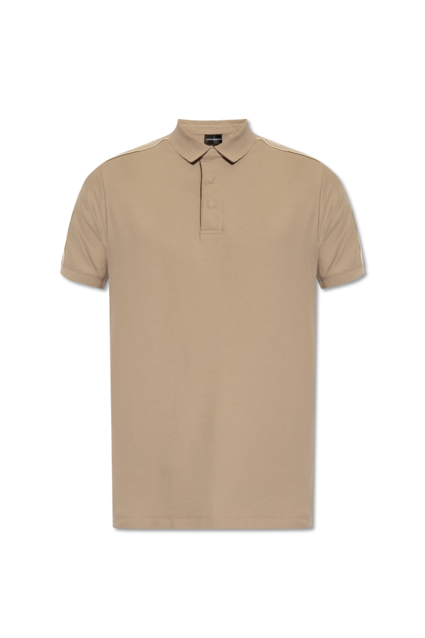 Greyish-beige and cream polo shirt from Emporio Armani. Made from cotton, this style showcases a collar with snap closures, side slits, short sleeves and an embroidered logo for brand recognition.