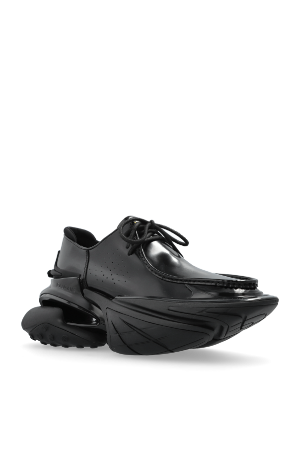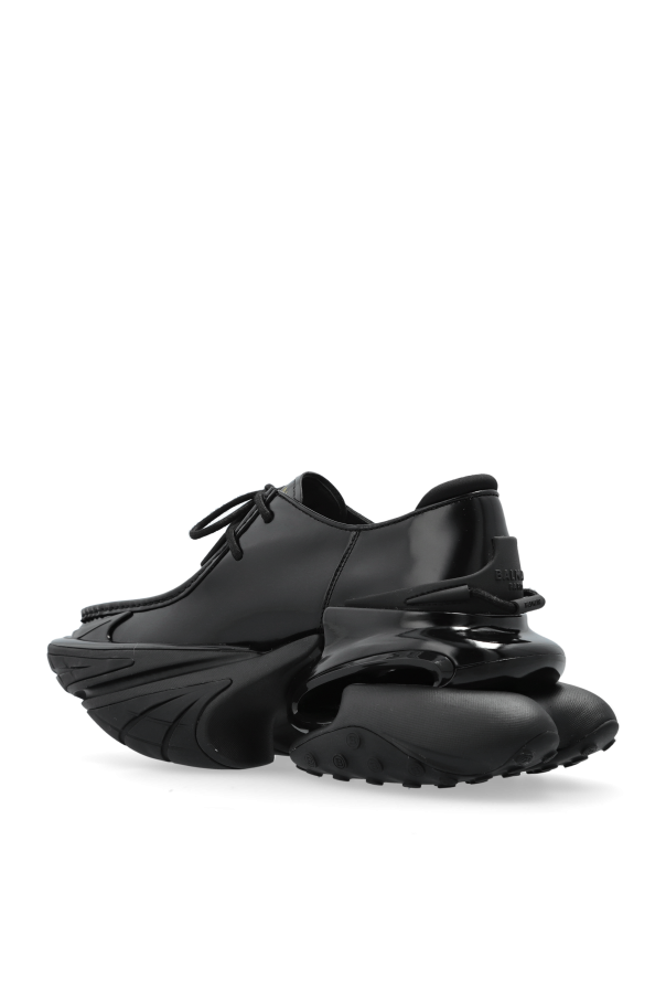 Introducing the exclusive Unicorn leather sneakers, a dazzling creation by the renowned fashion house, Balmain. These sneakers boast a futuristic design with a sculpted, robust sole that exudes modern sophistication. The upper is crafted from smooth, glossy leather, enhancing their elegance, while classic lacing adorns the top. Inside, the designer’s logo is meticulously placed, underscoring their luxurious allure. Perfectly suited for an elegant ensemble, these sneakers represent a harmonious blend of style and innovation. Dlaczego warto kupić ten produkt? Futuristic Design: Unique sculpted sole for a contemporary look. Luxurious Materials: Crafted with premium leather and rubber for durability and style. Iconic Brand: Designed by Balmain, a name synonymous with elegance and innovation. Elegance and Comfort: Ideal for both casual and formal occasions.