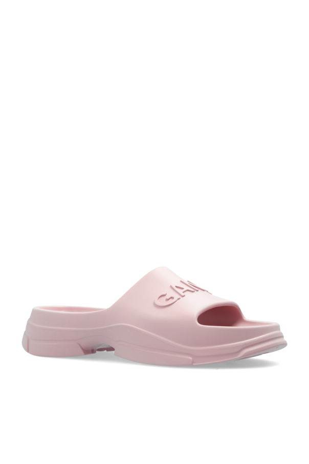 Pink slides from Ganni. Made from rubber, this model showcases a raised logo on the front.