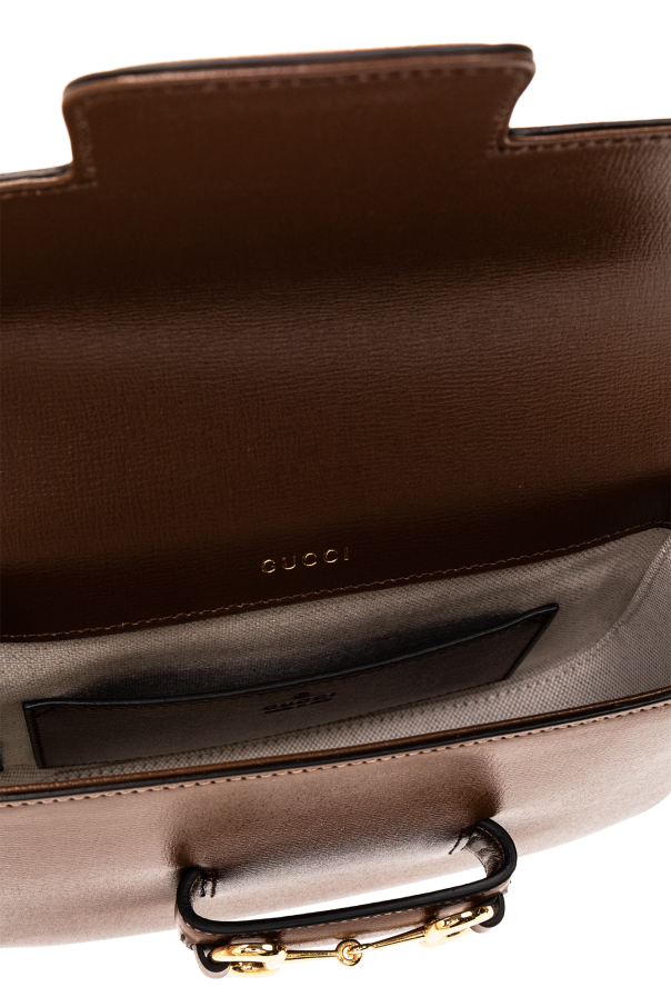 Brown ‘Horsebit 1955 Mini’ shoulder bag from Gucci. Crafted from calf leather, this design showcases the brand\'s signature horsebit hardware on the front, two detachable and adjustable shoulder straps – one is made of nylon with a signature green and red Web motif, gold-tone metal elements and one internal compartment with a card slot.