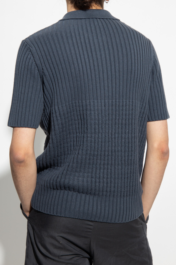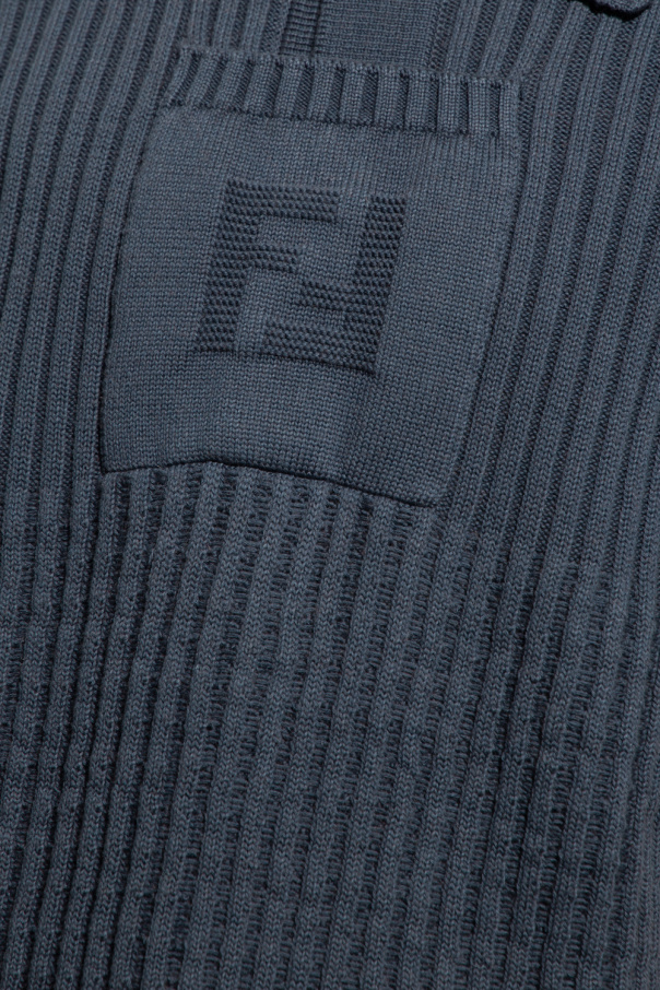 Navy blue polo shirt from Fendi. Knitted from a cotton and cashmere blend, this style features a button placket, short sleeves and a black logo patch accompanied by logo embroidery on the front.