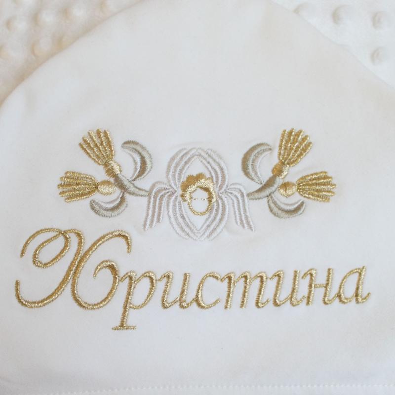 Іменна крижма-плед для хрещення дитини з кутиком з авторською вишивкою Ангели-Серафими в молочному кольорі.