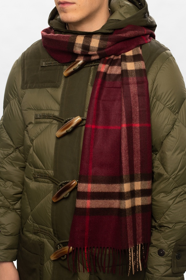 Maroon and brown scarf from Burberry. Made of cashmere, this item is decorated with an embroidered check pattern and fringe edges.