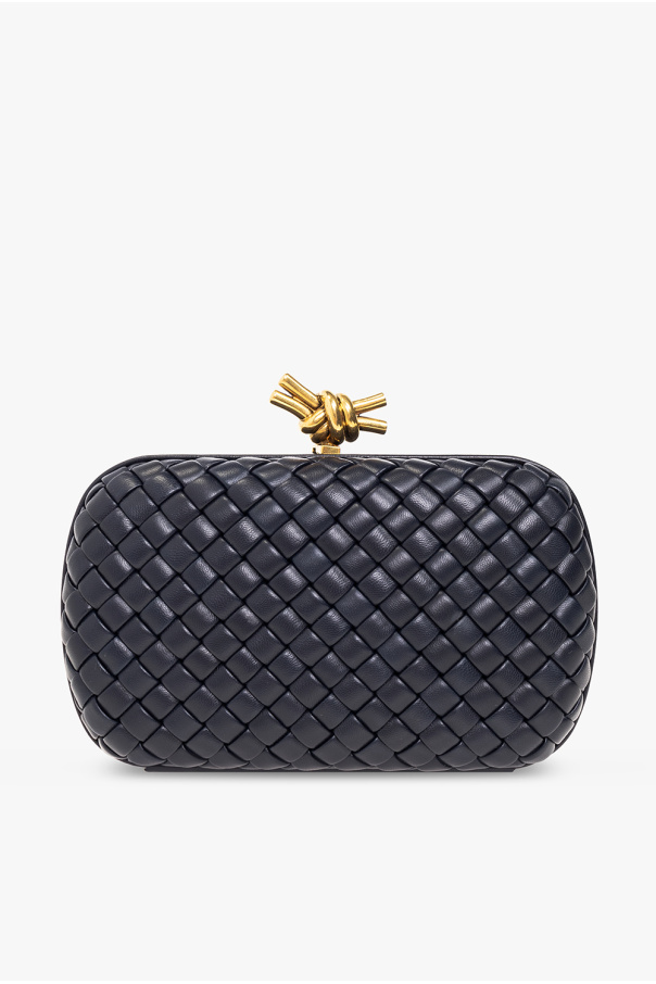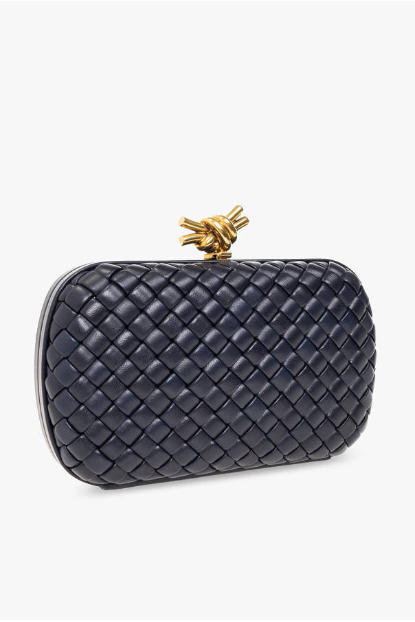 Navy ‘Knot Small’ clutch from Bottega Veneta. Made of lamb leather with the brand\'s signature Intreccio weave, this model features a brass closure with a knot detail in antique gold-tone, one internal compartment and gold-tone metal hardware.