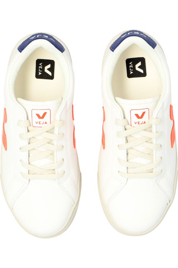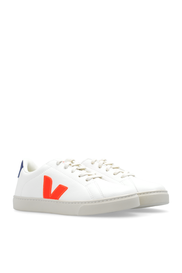 White ‘Esplar’ sneakers from Veja Kids. Made of tanned chrome-free leather, this lace-up model features a neon orange logo patch and a navy blue heel counter with a logo. The mesh inner lining made from recycled materials was developed to acquire a better resistance to friction. The organic-sourced and recycled insole consists of sugar cane, Amazon rubber, organic cotton and recycled EVA. It is set on a cream rubber sole. Named in tribute to a Brazilian NGO the label has been working with since 2005. ESPLAR (Rural Planning and Consulting Association) supports organic and family farming in the Nordeste region.