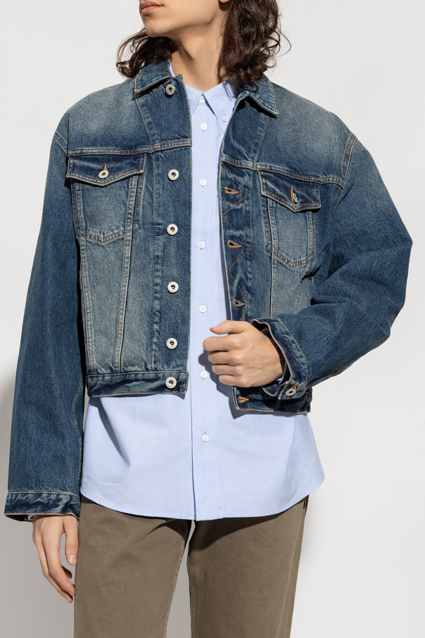 Blue denim jacket from Kenzo. Fastened with silver-tone logo buckles, this garment features beige stitching details, two buttoned flap pockets, logo patch at the back and long sleeves with buttoned cuffs.