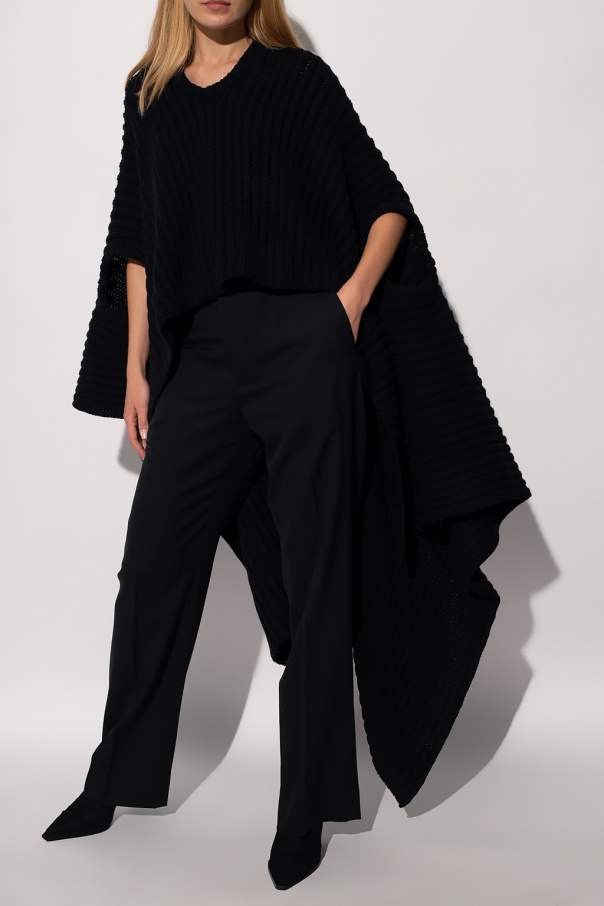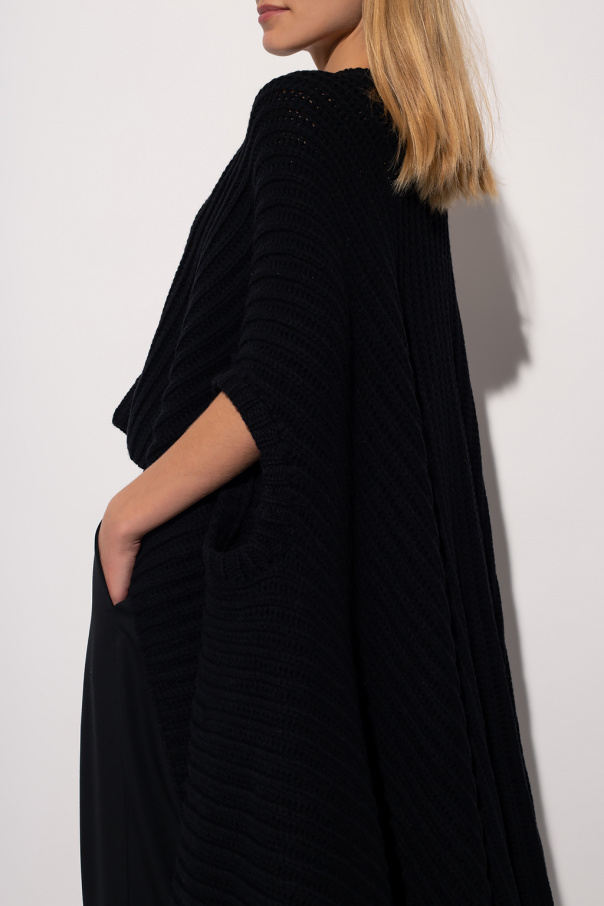 Black ‘Kris’ poncho from Ann Demeulemeester. Crafted from wool, this style features a round neck and ribbed detailing.