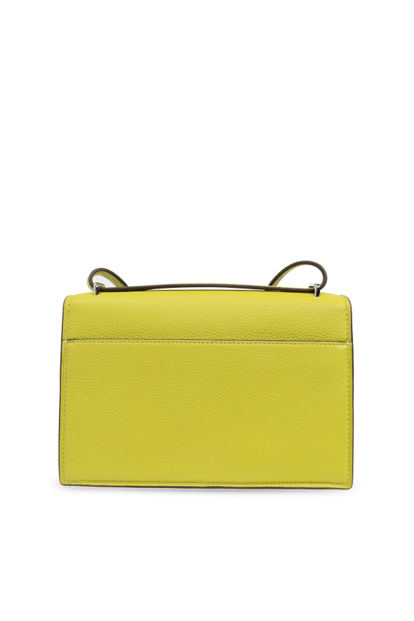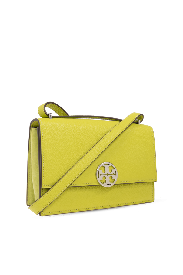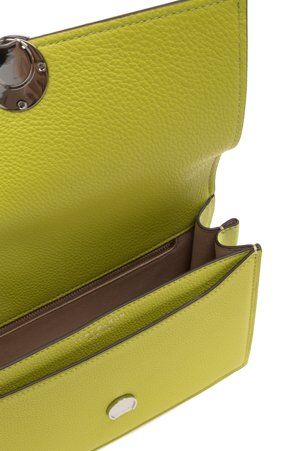 Introducing the \'Miller\' Shoulder Bag by Tory Burch, a masterpiece of elegance and craftsmanship. This exquisite accessory is presented in a vibrant shade of green, immediately catching the eye with its luminous allure. Crafted from premium, fine-grained leather, the \'Miller\' bag epitomizes luxury and durability. The bag\'s distinct rectangular silhouette, complemented by a flap closure, encapsulates sophistication. A standout feature is the designer\'s circular, metallic logo adorning the front flap, creating a striking contrast with its intricate cut-out pattern. The meticulous stitching accentuates the high-quality construction, indicative of Tory Burch\'s attention to detail. Functionality meets style with the \'Miller\'. Its interior, lined in a contrasting darker fabric, includes a main compartment and additional pockets for organization, secured with a magnetic snap closure. The bag\'s versatility is enhanced by a detachable, adjustable strap, allowing for shoulder or crossbody wear. Silver-toned metal elements, harmonized with the logo, add a final touch of elegance. Why Purchase This Product? Exquisite Craftsmanship: Constructed from 100% leather with precise stitching and fine details. Versatile Design: Features a detachable, adjustable strap for multiple wearing styles. Signature Elegance: The metallic logo adds a distinctive, stylish accent. Functional Elegance: Organizational pockets inside and a magnetic snap closure for convenience and security. Designer Appeal: A Tory Burch creation, synonymous with luxury and quality.