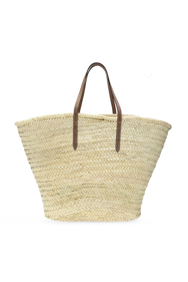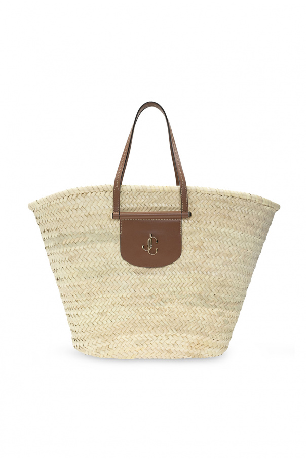 Beige ‘Macy’ shopper bag from Jimmy Choo. Crafted from woven raffia and calf leather, this design features a gold-tone logo appliqué, two half-round handles, one internal compartment and leather trims in brown.
