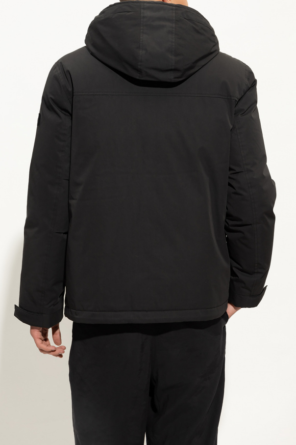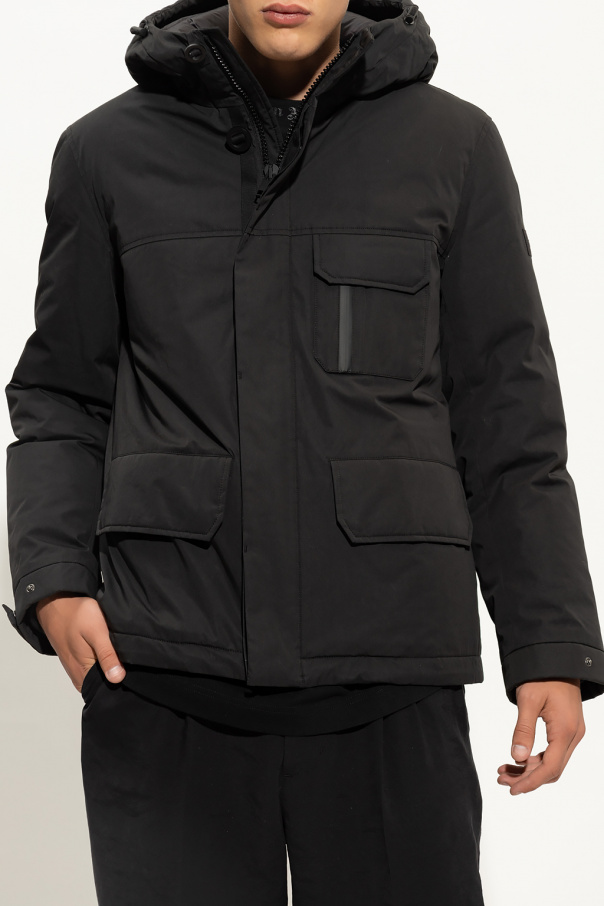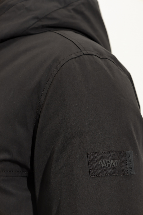 Black down jacket from Yves Salomon, the ‘Army’ line. Fastened with a zip and button, this garment features a drawstring hood, sleeve patch with a logo, three snap-fastened flap pockets, drawstring hem and long sleeves with ribbed cuffs and adjustable snaps.