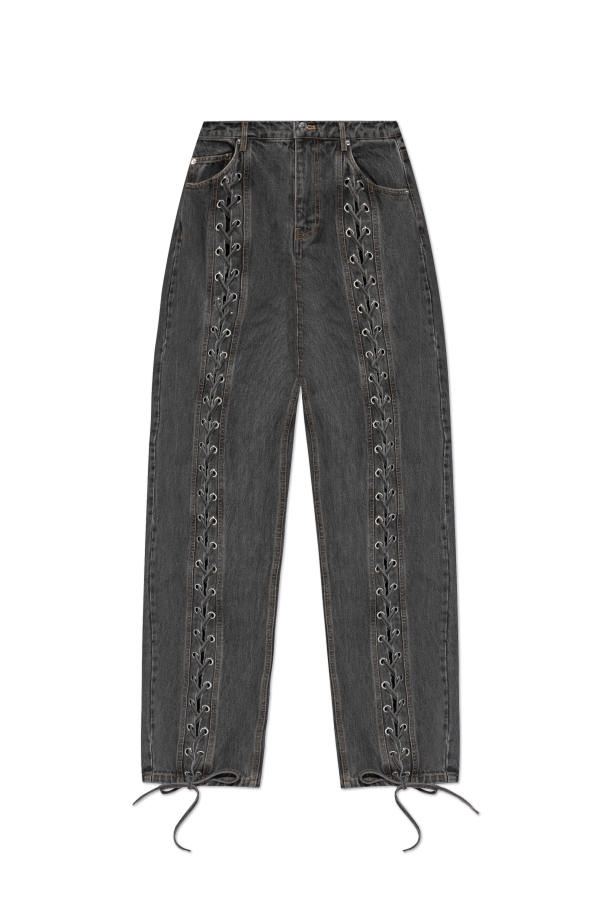 Introducing the Gray Straight-Leg Jeans by the illustrious Copenhagen-based brand, ROTATE. These exquisite jeans epitomize refined style with their straight-cut legs and a distinctive decorative lacing that runs gracefully along the sides, from waist to hem. The lacing, held by metal eyelets, imparts a unique aesthetic to these jeans. Crafted from premium, rigid 100% cotton denim, these jeans offer a structured silhouette with minimal stretch, ensuring durability and shape retention. The classic rear pockets enhance their timeless appeal, while the secure zipper and button closure adds functionality to fashion. ROTATE, established in 2018 by Birger Christensen alongside Jeanette Madsen and Thora Valdimarsdottir, is renowned for infusing Scandinavian wardrobes with a hint of glam. Embracing bold silhouettes with an \'80s influence, ROTATE\'s creations are crafted from luxurious, responsibly sourced materials, ideal for both party and everyday wear. Why Choose This Product? Exquisite decorative lacing with metal eyelets for a unique look. Structured, high-quality 100% cotton denim. Classic design with modern edge from a renowned designer brand. Versatile style suitable for various occasions.