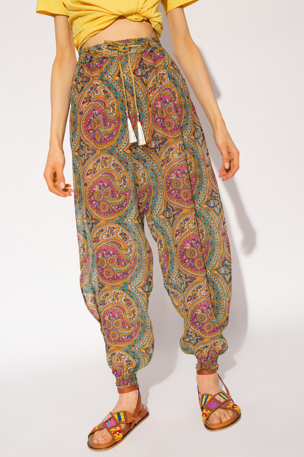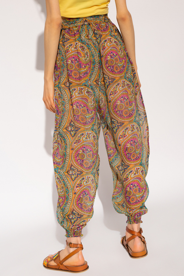 Multicolored joggers from Etro. Crafted from slightly sheer silk, this pair features a drawstring fastening with tassels, multicolored paisley pattern, two slip pockets and loose-fitting legs with elasticated cuffs.