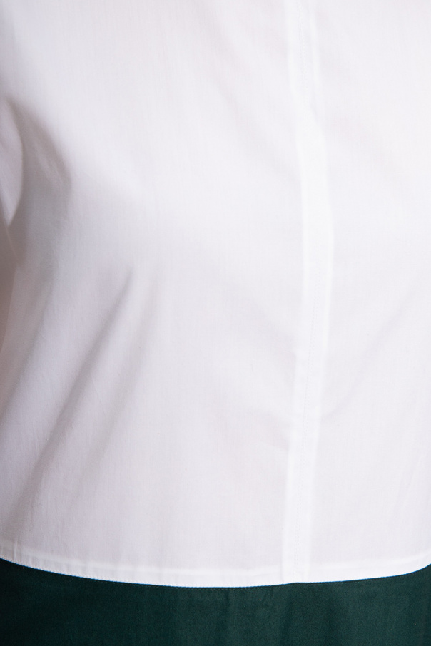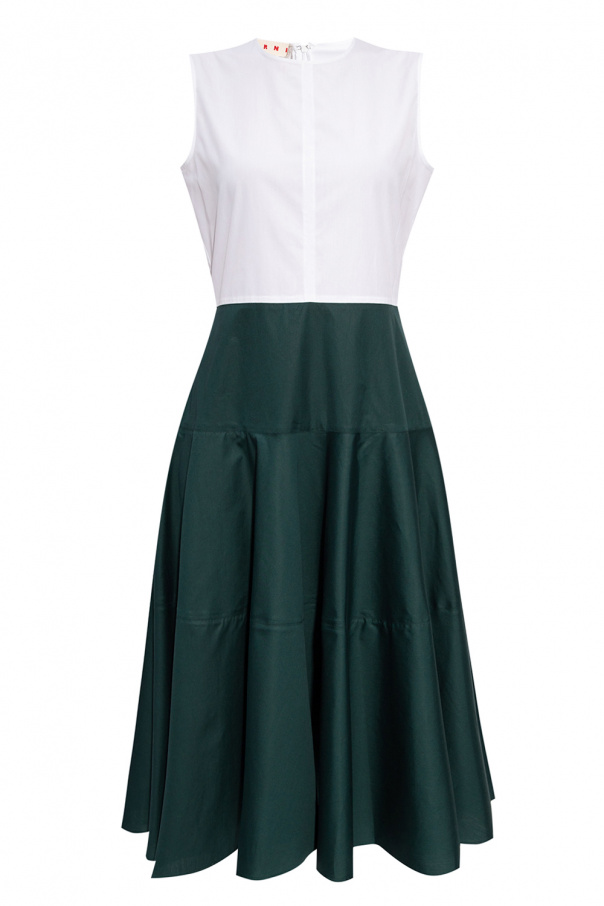 White and green flared sleeveless dress from Marni. This round neck design fastens with a zip and hook.