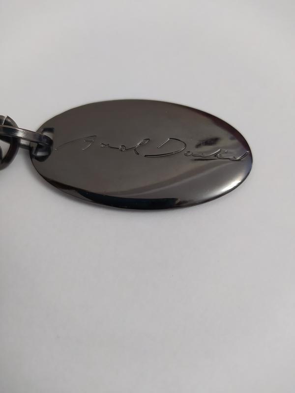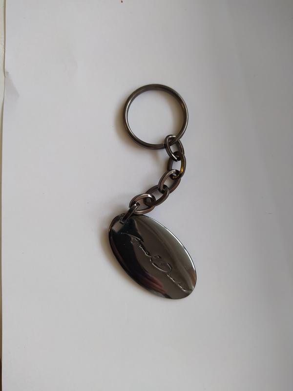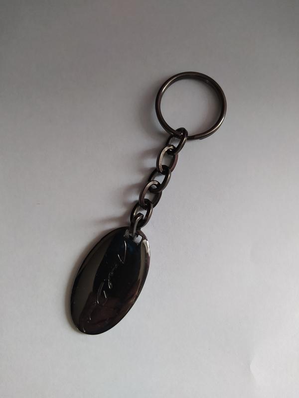Брелок для ключів сріблястого кольору з написом з одного боку