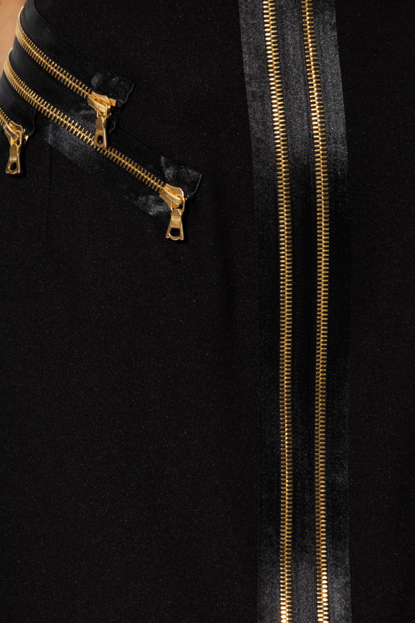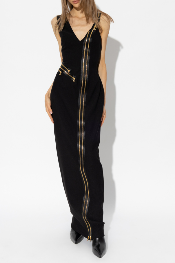 Black sleeveless maxi dress from Undercover. Fastened with a zip, this asymmetric fitted silhouette is complete with satin trims and gold-tone zip details.
