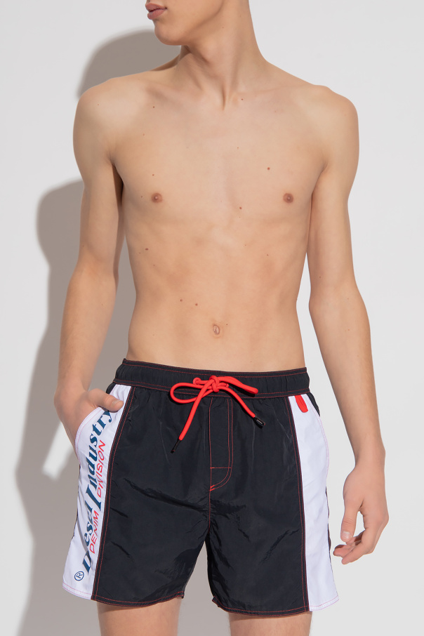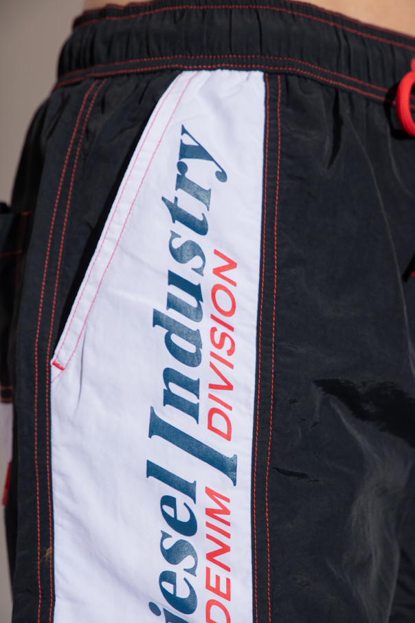Black, white and red ‘BMBX-CAYBAY’ swim shorts from Diesel. This pair features an elastic drawstring waistband, navy and red logo pattern, two slip pockets and one velcro-fastened pocket.