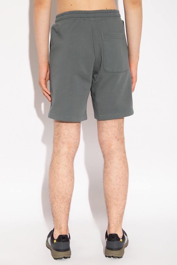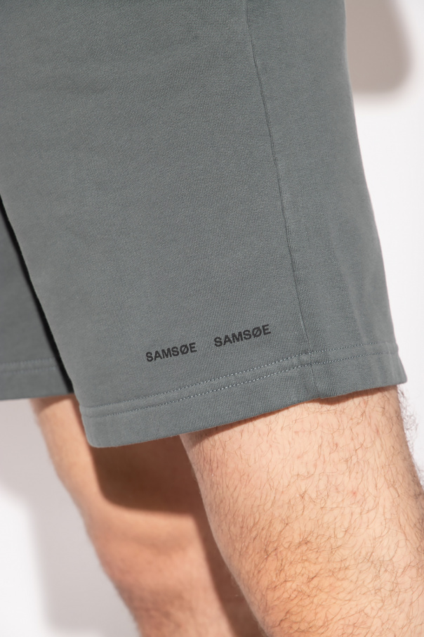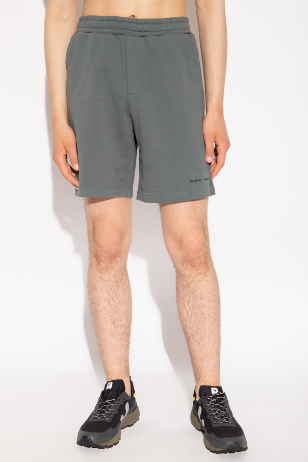 Greenish grey ‘Norsbro’ shorts from Samsoe Samsoe. Crafted from organic cotton, this pair features a drawstring waistband, three slip pockets and a printed black logo.