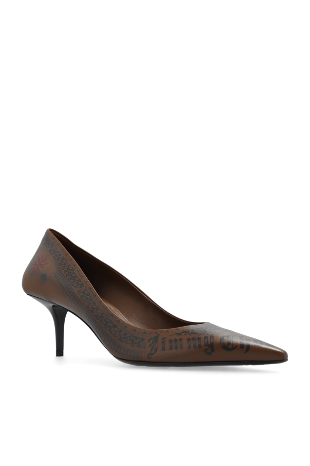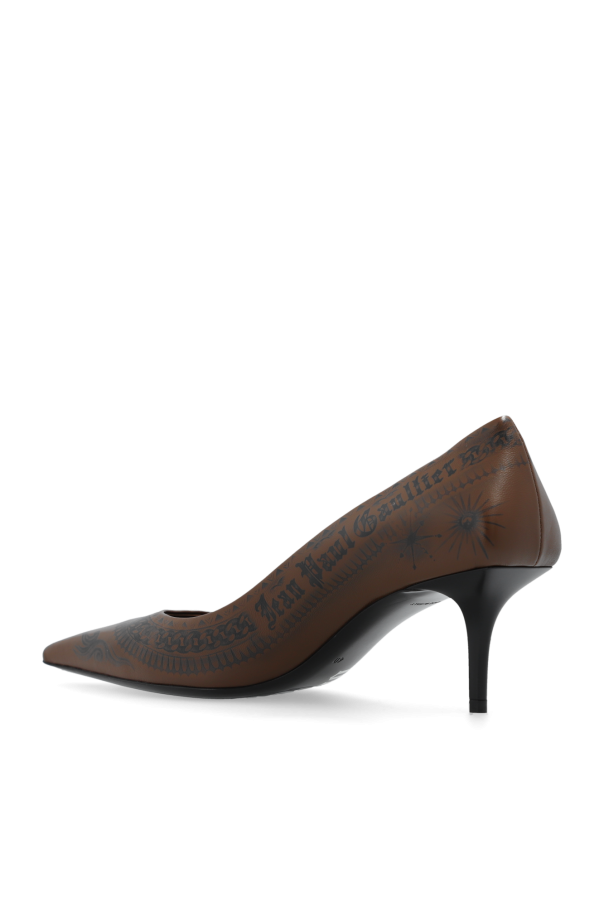 Brown pumps from Jimmy Choo x Jean Paul Gaultier. Made of leather with a pointed-toe silhouette, this model sits on a black leather sole with a white logo and showcases a black and red pattern inspired by tattoo art.