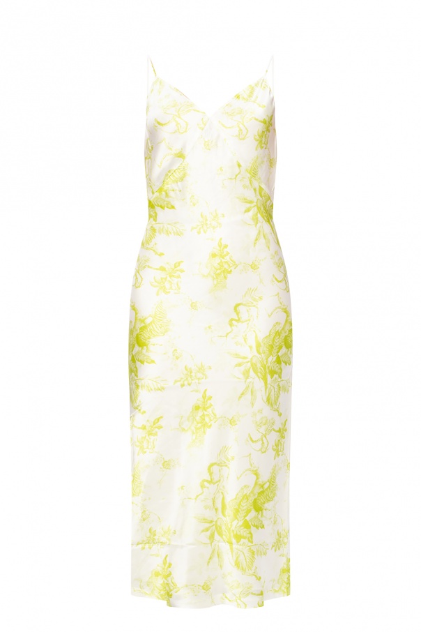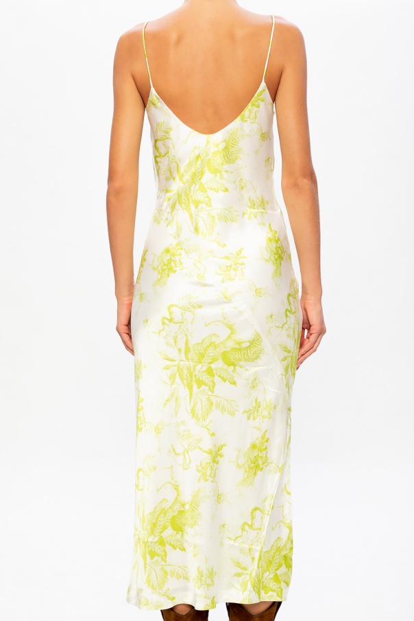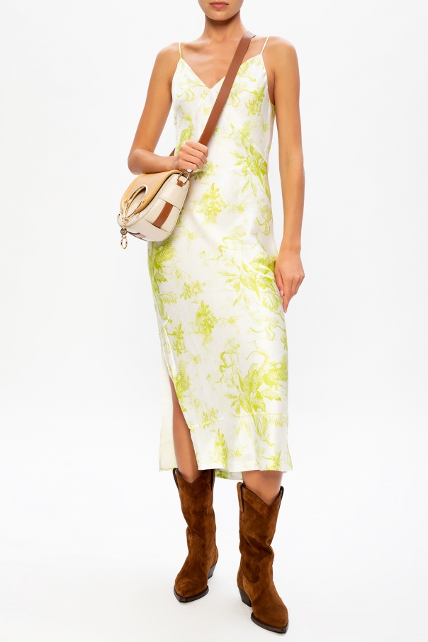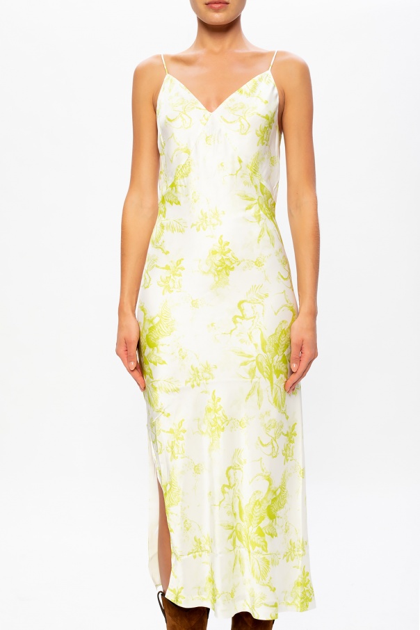 White ‘Melody’ dress on straps from AllSaints. This garment is enriched with a green floral print and side slits.