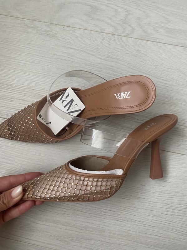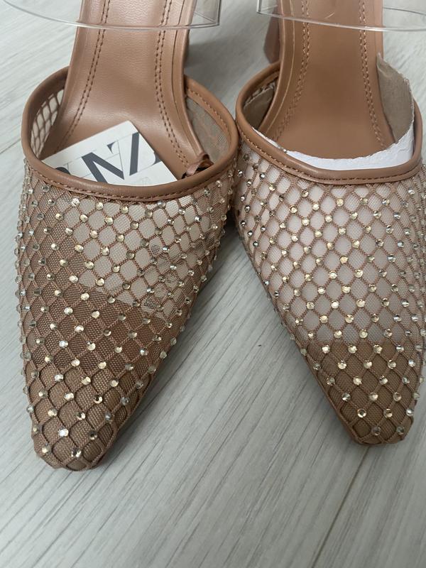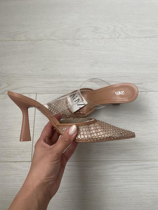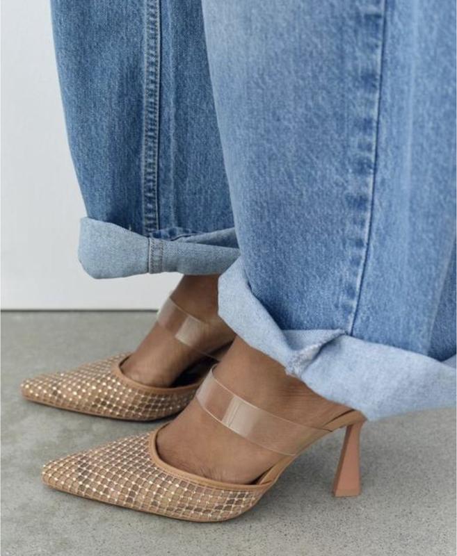 Вінілові сітчасті мюлі на підборах. Вініловий ремінець на підйомі та гострий носок.