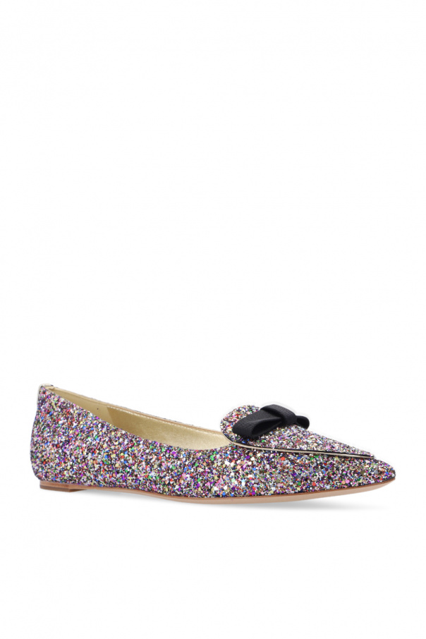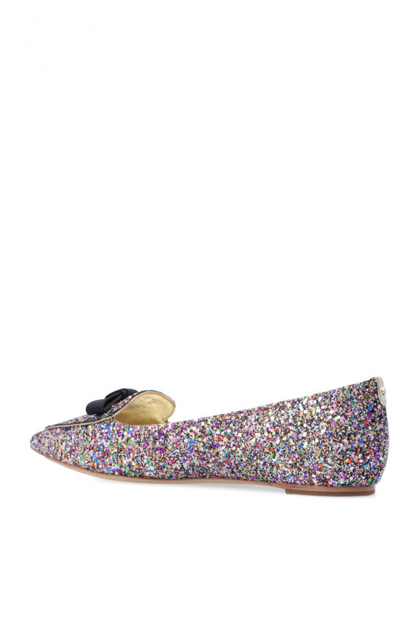 Multicoloured ‘Poppy’ ballet flats from Kate Spade. Sitting on a beige leather sole, this model showcases a pointed toe silhouette and a black bow.