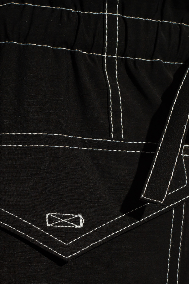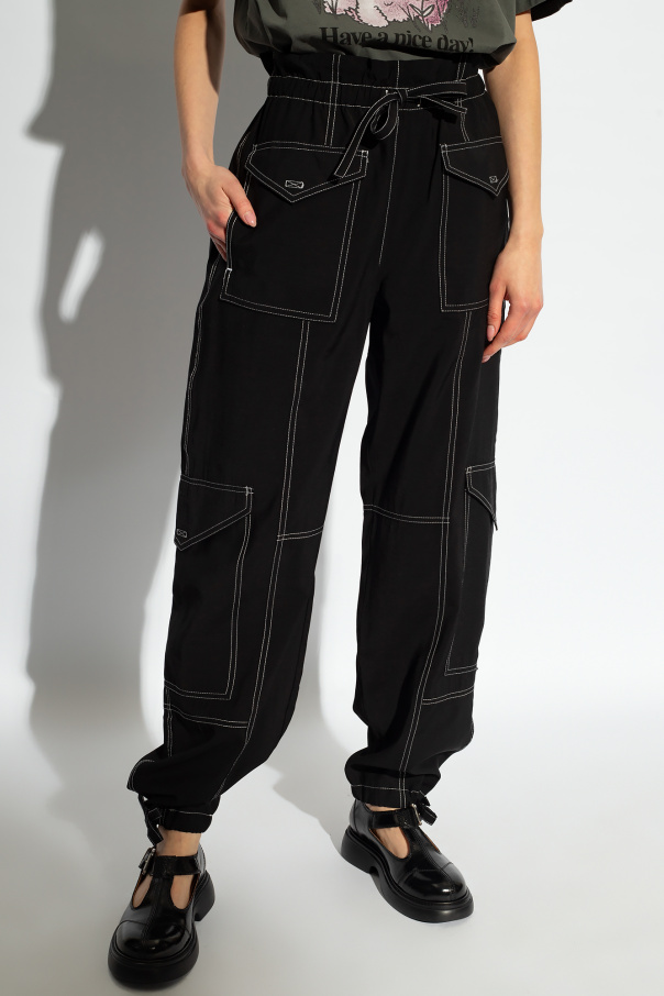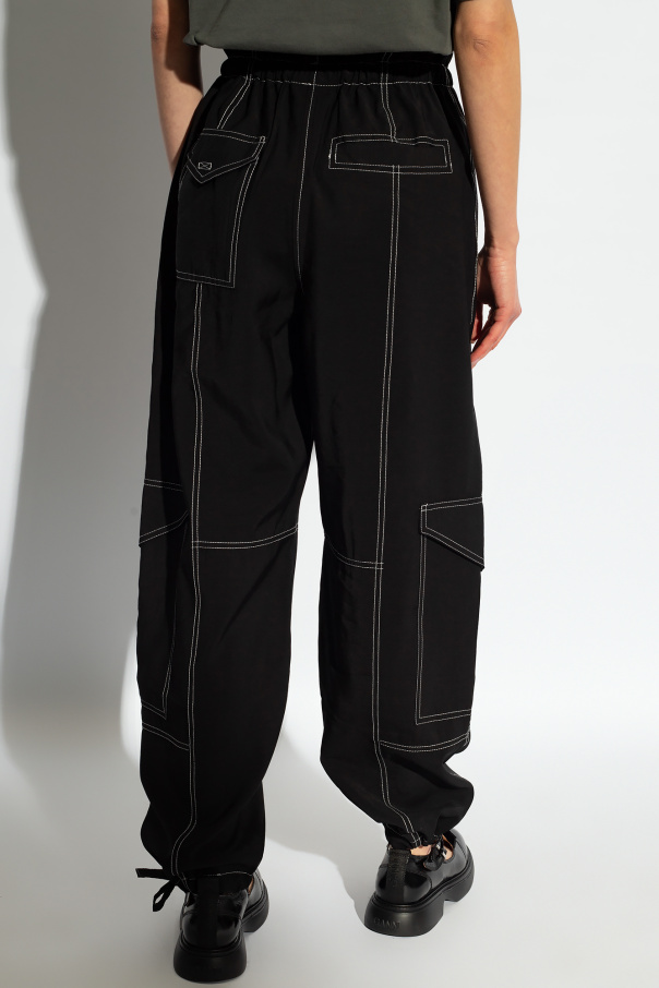Black cargo trousers from Ganni. Made of an eco-friendly LENZING™ECOVERO™ viscose, this pair falls with relaxed-fitting legs and features a drawstring waistband, multiple pockets, contrasting white stitching details and drawstring cuffs.