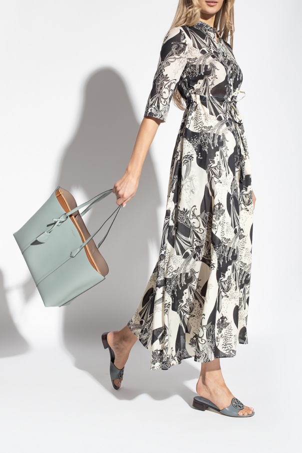 Blueish-grey ‘Miller’ mules from Tory Burch. Crafted from leather, this model showcases the brand\'s iconic ‘Double T’ logo hardware on the front and a brown and beige leather sole with anti-skidding rubber inserts.