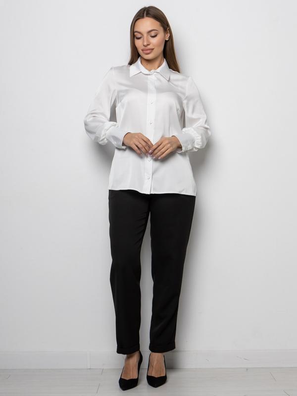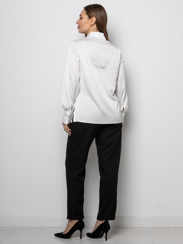 Элегантная блуза свободного кроя из шелка "Армани". Изделие с отложным воротником. Длинные рукава с широкими манжетами на пуговицах. Сбоку снизу дополнена разрезами в боковых швах. Застегивается на пуговицы по планке.