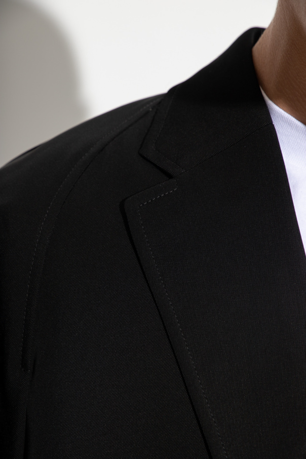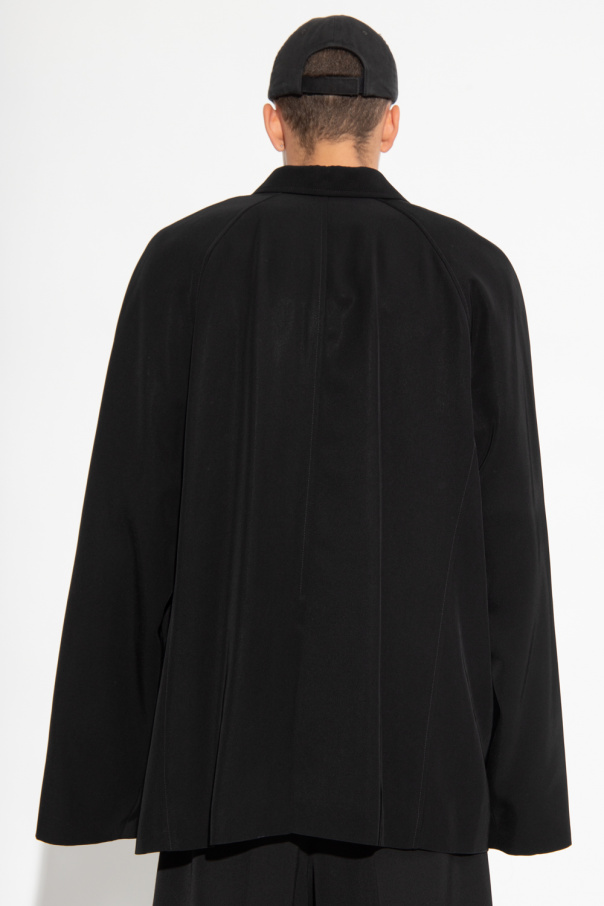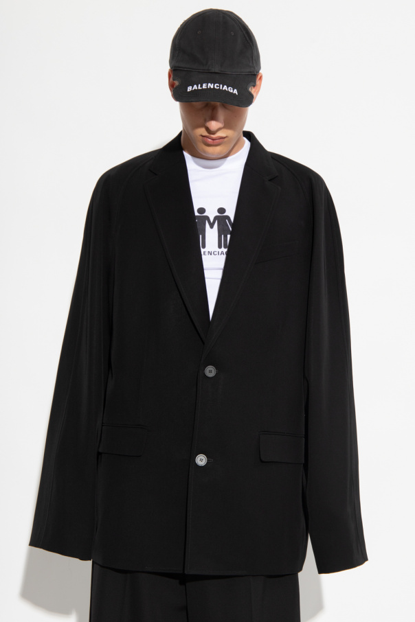 Black twill blazer from Balenciaga. Fastened with buttons, this garment is complete with notch lapels, two flap pockets, one slip pocket, long sleeves and single rear vent.