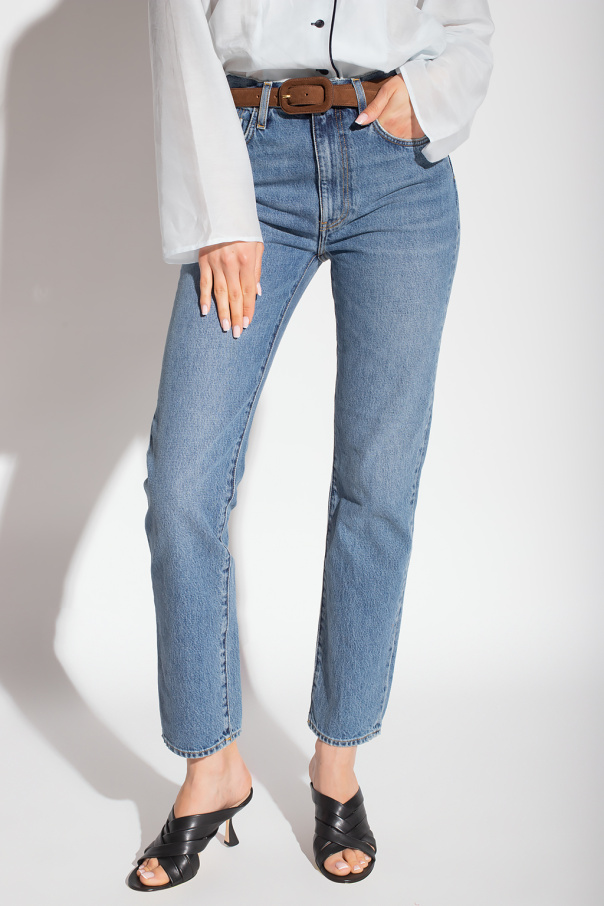 Blue high-waisted jeans from Toteme. Made of organic cotton, this garment features buttons with an engraved monogram, this pair features five slip pockets, brown monogram patch at the back and straight, cropped legs with raw trims.