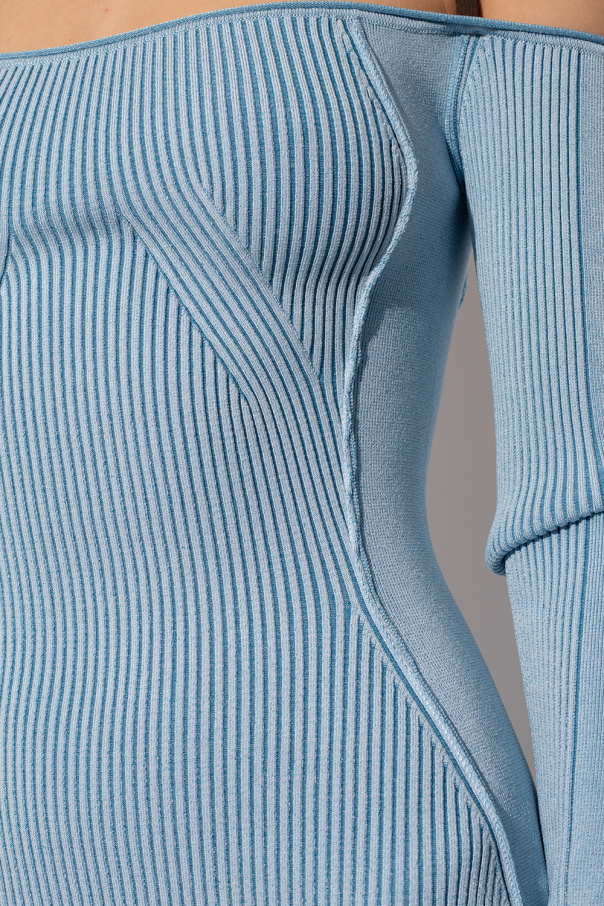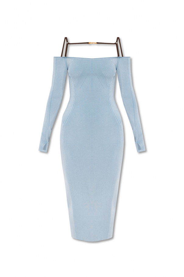 Light blue dress from Jacquemus. Crafted from a ribbed knit, this style features long sleeves, denuded shoulders, adjustable shoulder straps in brown and a gold-tone metal logo plaque.