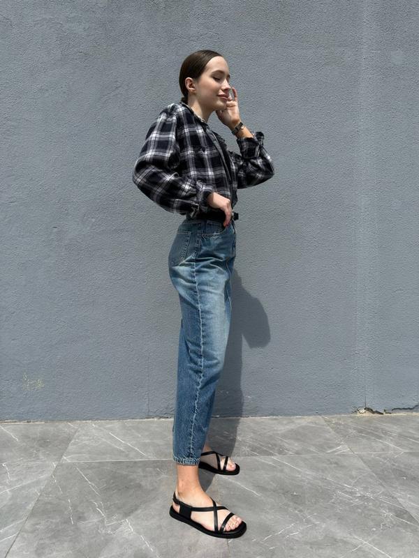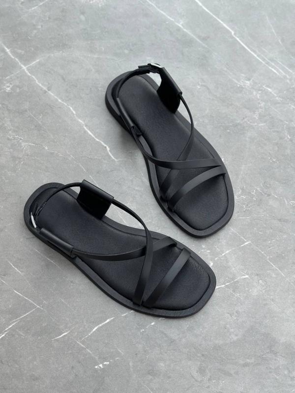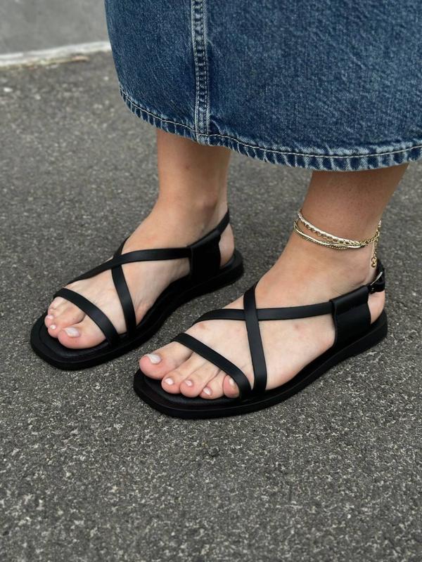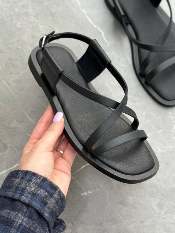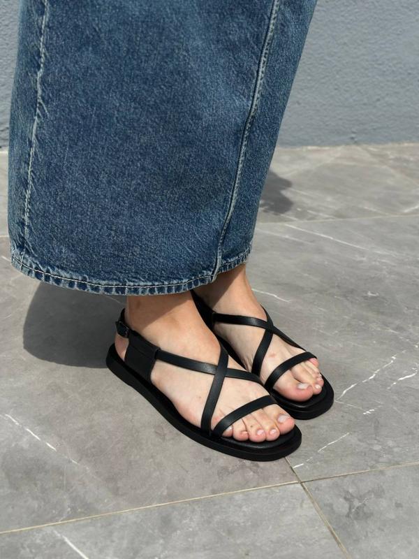 Жіночі босоніжки чорного кольору з натуральної шкіри на плоскій підошві.