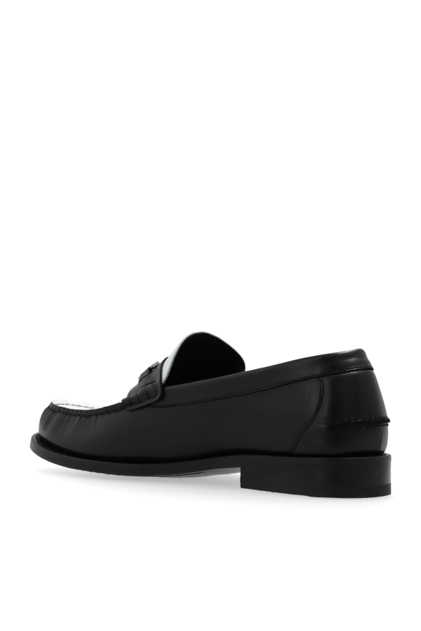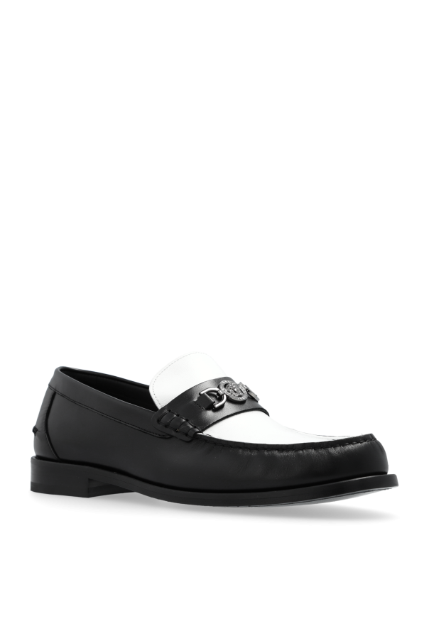 Introducing the epitome of sophistication and timeless style: the Versace Black and White Loafers. Crafted with meticulous attention to detail, these loafers are a harmonious blend of classic elegance and modern flair. The dominant black hue exudes a sense of power and versatility, making these shoes a perfect match for both formal and business attire. The loafers feature a striking white panel on the upper, adorned with a signature metal buckle that captures the essence of the Versace brand. This contrasting detail not only adds a touch of uniqueness but also serves as a bold statement of the designer\'s creativity. The glossy finish of the high-quality leather or leather-like material enhances the shoe\'s luxurious appeal, while the flat, modest heel and rounded front ensure an unparalleled level of comfort and ease of wear. These loafers are not just a footwear choice; they are a testament to the wearer\'s impeccable taste and the designer\'s unmatched craftsmanship. The Versace logo, subtly placed on the insole, is a discreet nod to the luxury and exclusivity that come with wearing a piece from one of the world\'s most renowned fashion houses. Why Purchase These Versace Loafers? Unmatched Elegance: The classic silhouette paired with the distinctive black and white design offers a timeless appeal. Exclusive Design Details: The contrasting panel and signature metal buckle highlight the unique Versace aesthetics. Luxurious Comfort: Crafted from 100% leather, these loafers promise both durability and supreme comfort. Versatility: Perfect for any formal or business occasion, these shoes will complement your sophisticated wardrobe effortlessly.