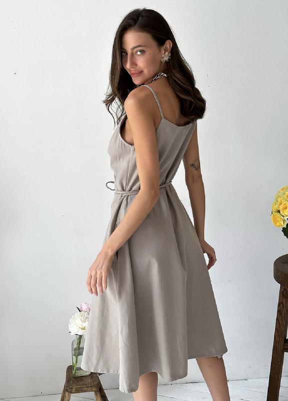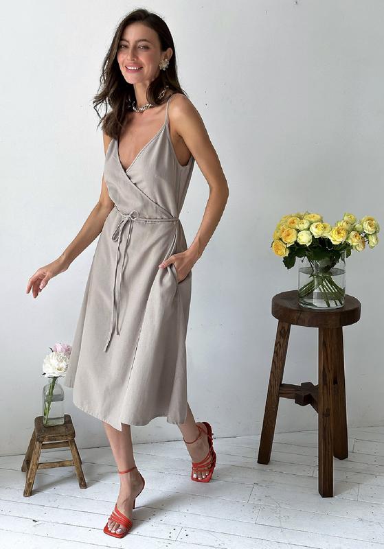 Льняное платье миди на запах под пояс