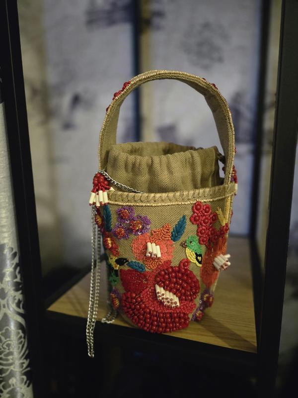 Сумка із бісером. Є маленька ручка та довгим ланцюжком через плече. Можнв застібнути через затягуванням шнурків.